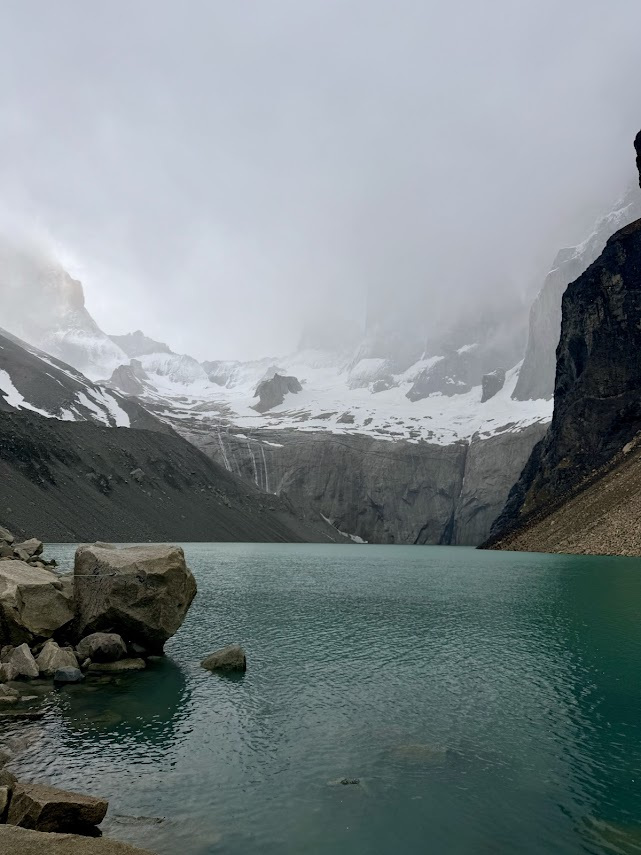 Our first hiking day took us to the base of the Torres—20 kilometers with 1,300 meters of elevation gain. Snow fell at the highest point, obscuring our view of the iconic towers, but the hike itself was beautiful. With so many people on the trail, getting lost was impossible. We left our large packs at camp and carried only day packs—highly recommended whenever possible.